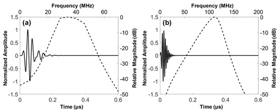 Simulated pulse-echo responses (solid line) and their frequency spectra (dashed line): (a) 35-MHz and (b) 105-MHz elements of the dual-element focused transducer.