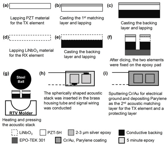 For fabrication of the 35-MHz element, a bulk PZT of 1.0 × 1.0 cm2 was fixed onto a glass plate using paraffin wax and lapped to a desired thickness of 59 μm. The lapped bulk PZT was sputtered with Cr/Au (500 Å/2000 Å) and then surrounded by plastic bars to construct dams. The mixture of 2–3 μm silver particles with Insulcast 501 and Insulcure 9, which is called silver epoxy in this paper, was poured into the dams on the bulk PZT, centrifuged, and cured at room temperature for 24 h in a dry box. The silver epoxy was lapped to a desired thickness of 11 μm and removed from the glass plate. The bulk acoustic stack was turned upside down on another glass plate and fixed again with paraffin wax. Backing material was cast onto the bulk PZT, cured at room temperature for 24 h, and lapped to a target thickness of 424 μm. The bulk acoustic stack was diced to a size of 0.5 × 0.5 mm2 using a dicing machine (DAD 322, Disco Corp., Tokyo, Japan). The 105-MHz element was comprised of one matching layer, LiNbO3, and a backing block. A bulk LiNbO3 of 1.0 × 1.0 cm2 was fixed onto a glass plate using paraffin wax and lapped to a desired thickness of 28 μm. The lapped bulk LiNbO3 was sputtered with Cr/Au (500 Å/2000 Å) and then surrounded by plastic bars to construct dams. The conductive epoxy was poured onto the bulk LiNbO3, cured at room temperature for 24 h, and lapped to a target thickness of 466 μm. This thickness was determined so that the final thickness of the 105-MHz element is equal to that of the 35-MHz element. The bulk stack piece was diced to a size of 0.5 × 0.5 mm2 using the dicing machine.