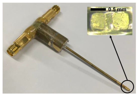 For geometric conformation of the two elements, an epoxy pad with a thickness of 200 μm was prepared. The epoxy pad was made of EPO-TEK 301 epoxy (Epoxy Tech Inc., Billerica, MA, USA), and its role was to prevent the connection between the electrical signal wires and ground. The two elements were fixed on the epoxy pad by using 5 min Epoxy (ITW Polymers Adhesive North America, Danvers, MA, USA), and press-focusing was performed using an RTV molder with a curvature of 2.5 mm radius for geometric focus. Details of the press-focusing method can be found in [25]. The spherically shaped acoustic stack was fixed with 5 min epoxy at the end of a brass housing tube with an inner diameter of 1 mm. For the electrical signal, two 42 AWG micro-coaxial cables were connected to the backing blocks of each element. The empty area in the brass housing was filled with 5 min epoxy for electrical insulation. Two signal wires were attached to a SMA connector used for connection to an imaging system. Cr/Au (500 Å/2000 Å) was deposited on the brass housing tube and the acoustic stack for ground connection. Finally, Parylene C was deposited for the first matching of the 105-MHz element as well as shielding of the transducer surface and the second matching of the 35-MHz element. Figure 5 illustrates the fabrication process, and Figure 6 shows the photograph of the fabricated dual-element focused transducer.