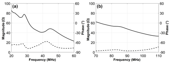 Measured electrical impedance magnitudes (solid line) and phase angles (dashed line): (a) 35-MHz and (b) 105-MHz elements of the dual-element focused transducer.