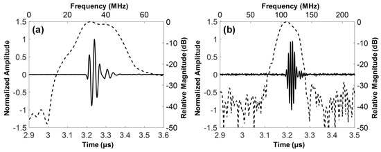 Measured pulse-echo responses (solid line) and their frequency spectra (dashed line): (a) 35-MHz and (b) 105-MHz elements of the dual-element focused transducer.
