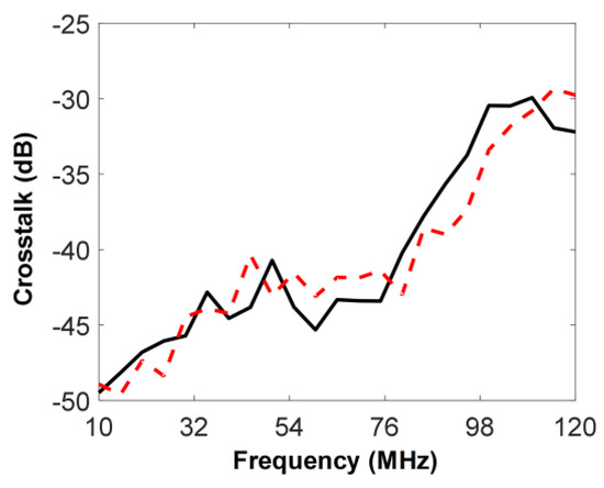 The crosstalk between the two elements was measured. For this, the IVUS transducer was immersed into the water container, and the reflector was replaced by an acoustic absorber. A five-cycle sinusoidal burst signal with 5 Vp-p was generated by a function generator (AFG3102, Tektronix Inc., Beaverton, OR, USA) and was sent to both 35-MHz element and oscilloscope with an input impedance set to 1 MΩ. At the same time, the voltage induced by the sinusoidal signal at the 105-MHz element was measured using the same oscilloscope. The frequency of the sinusoidal signal was changed from 10 to 120 MHz at 5 MHz intervals and the ratio of the output voltage of the 105-MHz element to the input voltage of the 35-MHz element was computed (see the solid line in Figure 9); the maximum crosstalk was −29.9 dB at 110 MHz. In addition, the crosstalk was measured from the 35-MHz element while exciting the 105-MHz element (see the dashed line) and the maximum crosstalk in this case was −29.4 dB at 115 MHz. Note that the crosstalk measured in this study is a combination of acoustic and electrical crosstalk. At the design stage, acoustic crosstalk was expected to be ignored because the 5 min epoxy filled kerf for acoustically and electrically isolating the two elements had a relatively large value of 0.1 mm, compared to those of conventional arrays. However, it was anticipated that electrical crosstalk would dominate overall crosstalk because there were two parallel wires inside the brass housing with a diameter of 1 mm. This can be confirmed by the measured crosstalk that increases with the frequency used for the measurement as shown in Figure 9. This is so because a pair of coupled lines generate electrical crosstalk with each other, and the crosstalk is linearly proportional to frequencies below a few hundred MHz [26]. Nevertheless, the crosstalk of the fabricated dual-element IVUS transducer is acceptable for imaging because the crosstalk of conventional ultrasound arrays typically has a value between −28 and −32 dB [27].
