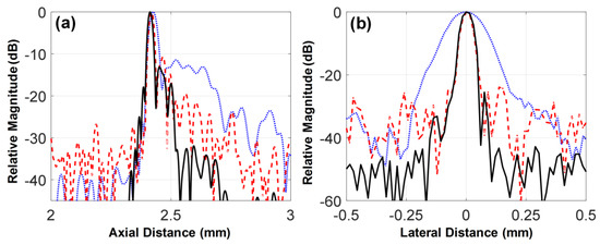 (a) Axial and (b) lateral beam profiles measured using a 25-μm wire located at the focal depth of the transducer, i.e., 2.5 mm. The dotted, dashed, and solid lines indicate the beam profiles obtained from the envelope signals of the 35-MHz fundamental, 105-MHz fundamental, and third harmonic scanlines, respectively.
