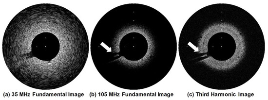 For tissue harmonic imaging, the spectrum of a transducer is typically divided into two sub-bands: one for transmission and another for harmonic reception. This causes lowering the axial resolution of both fundamental and harmonic images. Additionally, the complete separation of fundamental and harmonic signals is very challenging because their spectra are overlapped although pulse inversion and nonlinear chirp excitation can be used to overcome the problem partially [31,32,33]. Given these facts, the wide spectral bandwidth of a transducer is essential for high quality tissue harmonic imaging. However, it is practically impossible to construct a transducer with a broad bandwidth enough to carry out the third harmonic imaging of tissue. This is especially true for IVUS transducers because of their high operating frequency and limited selection of backing and acoustic matching materials due to the structural restriction. Even if possible, a severe degradation of spatial resolution is inevitable because the bandwidth should be divided into three sub-bands. As shown in Figure 13, the developed dual-element focused transducer can solve those problems. For ultrasound transmission, the full bandwidth of the 35-MHz element can be exploited, so that no degradation of spatial resolution occurs in fundamental images. This full-bandwidth signal contributes to the generation of the third harmonic, which is received by the 105-MHz element without (or at a minimum) loss of the harmonic information. Note that the frequency spectral characteristics of the 105-MHz element is similar to a band-pass filter, so that the signal separation is not necessary. Another advantage of the developed transducer is the simultaneous acquisition of co-registered 35- and 105-MHz fundamental images, which enables us to examine the overall morphological change of blood vessels and the near vessel layers such as fibrous cap with high spatial resolution at the same time if necessary.