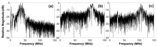 Frequency spectra of one scanline signal of the images in Figure 10: (a) 35-MHz and (b) 105-MHz fundamental imaging scanline, (c) third harmonic imaging scanline.