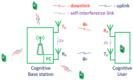 Herein, we consider a BS–CU transmission pair in centralized CRNs in which a number of CUs, centered by a BS, utilize a number of potential time-slotted primary channels, as shown in Figure 1. The BS is integrated with a fusion center (FC) used for making a global decision based on local sensing results sent from CUs. In addition, each CU is equipped with two separate antennas: one for transmitting and the other for receiving. Hence, in each time slot, the communications link between a CU and the BS can be configured either to transmit and receive simultaneously (FD mode), or to transmit and receive in turn in each half of the time slot (HD mode). Figure 1 shows the model of the considered system, where and denote the self-interference factors at the CU and BS, respectively, when the communications link is in FD mode.