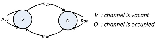 In each time slot, the state of each primary channel is represented as , where V and O denote the hypotheses that the channel is vacant or occupied, respectively. The state transition between two adjacent time slots is modeled as a two-state discrete-time Markov chain process, as shown in Figure 2, where denotes the transition probability from state i in the current time slot to state j in the next time slot. How these transition probabilities are obtained has been well-studied in the literature [26,27,28,29]; hence, we assume that the transition probabilities are known a priori. These transition probabilities are used to update the probability that the channel is vacant in the next time slot according to the available probability of the channel in the current time slot (also called the belief). Let be the belief of the primary channel in current time slot t. The belief in the next time slot can be calculated as follows: