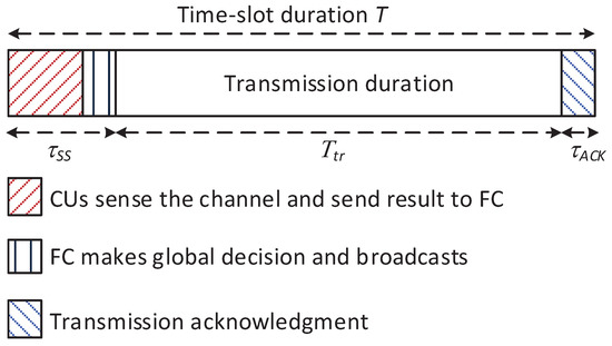 Additionally, let us consider that the link for each CU–BS transmission pair is assigned to one specific primary channel and the duration in which this channel is assigned to the transmission pair is much longer than one time slot. Thus, scheduling the long-term operation of this transmission pair over multiple time slots is considered in this work. Figure 3 illustrates the time frame for the operation of the CRN in one time slot. At the beginning of each time slot, to improve the reliability of the sensing process, collaborative spectrum sensing (CSS) is performed to detect a set of potential primary channels. After the CSS process, based on sensing reports from CUs, the FC makes a global decision for these channels and broadcasts it on a private common control channel. Ways of guaranteeing a common control channel in CRNs have been well-studied in other literature; thus, we assume that the common control channel is available here. According to the global decision, each CU–BS transmission pair decides either to stay silent or to start its transmission process on the channel assigned to them during the remaining time of the current time slot. Since CSS has been well studied in the literature [30,31] and the proposed algorithm is not dependent on combination rules at the FC, this work does not investigate CSS; we assume that the global probability of false alarm, , and the global probability of detection, , are given. Hereafter, we focus on improving the performance of a CU–BS transmission pair on the primary channel assigned to it.