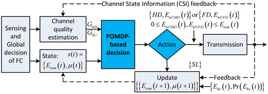 Figure 4 illustrates the solution based on the POMDP framework. In the time slot , after the CSS phase, when the global decision indicates that the channel is occupied, the CU trusts this result and stays silent during the remaining duration of the time slot. At the end of the time slot, the CU updates the amount of harvested energy during the time slot, the channel state probability (also called belief), and the remaining energy for use in the next time slots. Note that, for simplicity, this case is not shown in Figure 4. On the other hand, when the channel is vacant, based on the energy remaining in the battery, , the belief for the primary channel, and the channel state information (CSI) on about channel gain between the CU and the BS, the CU and the BS will choose the optimal action from among for the HD with transmission energy , for the FD with transmission energy , and staying in silent mode. The optimal action in time slot depends on the summation of the immediate reward in the current time slot and the expected future reward from time slot . The expected future reward is formulated based on the POMDP framework as follows.