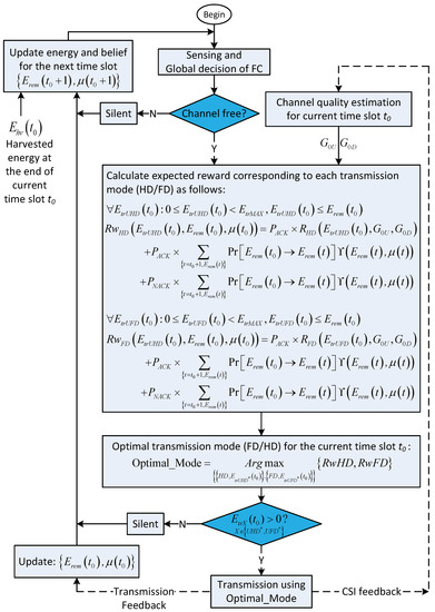 where stands for , which is calculated according to Equation (19) and is calculated according to Equation (40). We note that, in Equation (41), and are simplified notations that are calculated according to their observation context. Furthermore, the context consists of HD or FD transmission mode with the corresponding transmission energy, and , respectively, and possible feedback (i.e., , ) from the transmission at the end of time slot . To summarize the scheduling of the CU–BS transmission pair, we show the flowchart of its operation for the entirety of its operation time in Figure 5.