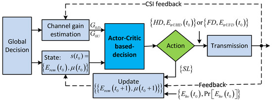 Figure 7 shows the overall actor–critic learning process for finding the optimal policy for maximizing value function . The training process is detailed as follows. At the beginning of the time slot, the actor selects an action with probability when the system is at state and starts the transmission process. At the end of the transmission, the system will determine the next state based on the amount of harvested energy and the amount of consumed energy during the time slot t and CSI according to the transmission feedback. When the action is silent or the transmission is unsuccessful, immediate reward will be zero; otherwise, is calculated with Equation (15) when the HD protocol is used and with Equation (8) when FD is used. We note that, when the amount of harvested energy during a time slot becomes greater than the storable space of the battery, the battery will overflow and the residual harvested energy will be wasted. To avoid entering this event, immediate reward will be set to zero if the battery overflows at the end of the time slot and the transmission energy corresponding to the selected action is not at the maximum level. Afterward, the temporal difference error is computed as , where denotes the value of before the action, as opposed to the value after observation. The value function is then updated as , and the tendency to select action is updated as , where and are positive step-size parameters. Finally, policy will be updated for use in the next state . The training process terminates when a convergence is made. After the training phase, we can obtain the following output: the set of policy and the set of value function corresponding to each state .