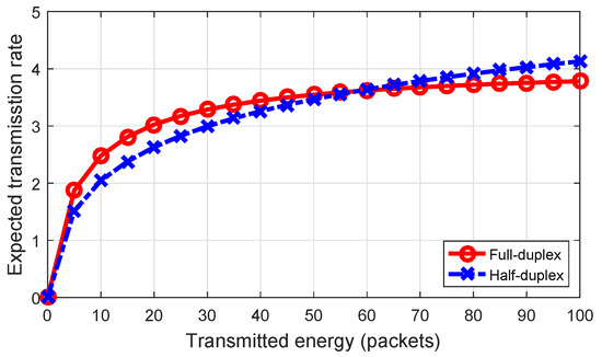 Figure 8 compares the expected transmission rates of the HD link with that of the FD link calculated based on Equations (8) and (15), respectively. The figure shows that, when transmitted energy increases, the expected transmission rate of the FD link increases slowly due to the stronger effect of self-interference. Thus, based on the amount of transmitted energy, we can choose either the FD or the HD protocol to achieve a higher transmission rate.