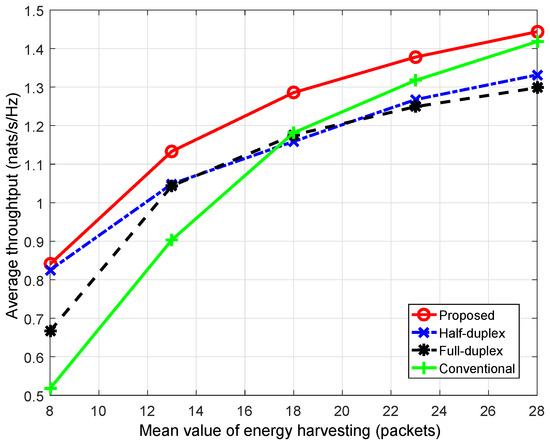 Average throughput according to the mean value of energy harvesting. The simulation was run for 1000 time slots, and the loop was executed 100 times.