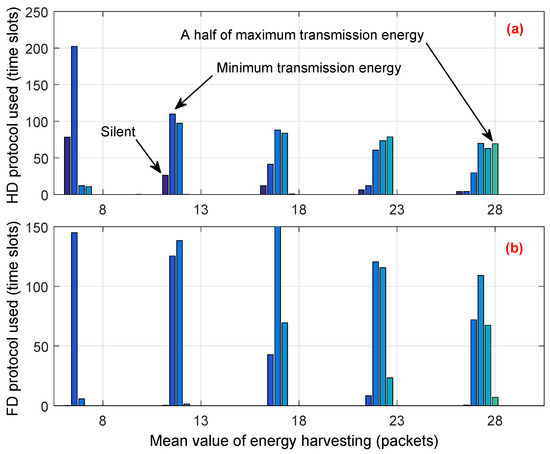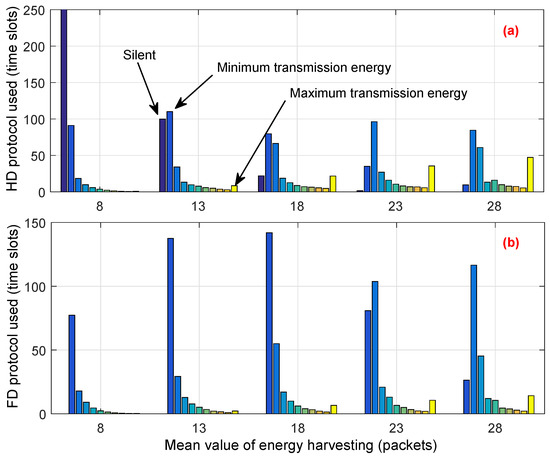 To explain how the proposed scheme can allocate an energy budget among time slots and utilize the vacant channel efficiently, in the simulation, we observed the decision of the CU for each time slot and counted the number of time slots where the CU transmitted by using either HD or FD transmission mode. The simulation was over 1000 time slots and the loop was 100 times. We note that, among 1000 time slots, the average number of vacant time slots is around 500. Simulation results are shown in Figure 10 and Figure 11. In both figures, each bar with the same color is aligned at the same position on the horizontal axis. The amount of transmission energy ranges between 0 and , and each group in the figures shows the distribution of transmitted energy from zero to the maximum value. Zero denotes that the CU proactively decides to stay in silent mode to save energy for use in future, or has to stay silent due to a lack of energy. In Figure 10a and Figure 11a, the dark-blue bar at the left of each group shows the total number of time slots where the CU has to stay or proactively stay in silent mode; the yellow bar shows the total number of slots where the CU decides to use maximal transmitted energy.