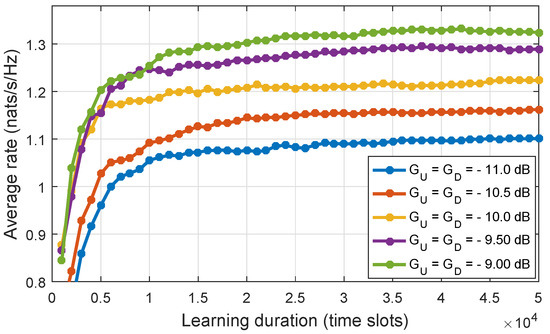 Finally, we adopt the actor–critic method to solve Equation (41) where the set of value function can be obtained directly during the learning process. The training process is implemented as follows: during the learning process, we calculate the average rate after every batch of 1000 time slots, and we then calculate the different rate, , between two consecutive updates. We define the convergence condition as . Generally, in the actor–critic algorithm, the training process often converge to a randomly local optimal policy. Therefore, in simulation, we repeat the learning process a number of times and select the policy that provides the maximum average rate. Figure 12 shows the average rate for different mean values of channel gain of the uplink and downlink when the learning process was executed on 50,000 time slots. When , the convergence condition can be matched after learning about 10,000–20,000 time slots.