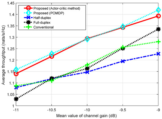 Figure 13 shows the average throughput solved by the actor–critic algorithm compared with that of the POMDP method according to the mean value of channel gain when . We can see that throughput by the POMDP method is slightly higher than that by the actor–critic method. Clearly, in the case of POMDP, the decision policy is obtained by searching the whole state space and action-space of the system; hence, optimal policy can be obtained. On the other hand, in the case of actor–critic algorithm, the policy is gradually reinforced during the learning process. Generally, the training process may converge to a randomly local optimal policy; thus, throughput by the actor–critic method can be slightly less than throughput by the POMDP method. As shown in the figure, the solution by the actor–critic method is nearly an optimal policy compared to the POMDP method. We note that the actor–critic method does not require a large number of formulations and computations to obtain the optimal policy.