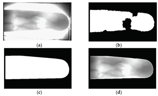 The Sobel operator and component labeling are applied to the captured finger images for noise removal. Then, binarized images, such as that shown in Figure 2b, are obtained through image thresholding. However, as shown in Figure 2b, incorrect binarized images are obtained often due to non-uniform illumination inside the finger area. To solve this, the convex hulls are found and calibrated []. Convex hulls are minimum-size convex polygons containing all areas. To set the part to be calculated, the height and width of the x coordinate, y coordinate, and finger-vein area of the top-left of the binarized images are calculated to set the bounding box that contains all of the finger-vein areas. The outermost pixel coordinate of the bottom-right area inside the bounding box containing binarized areas is determined as a starting point for convex hull construction. The outermost coordinate points of pixels with the furthest distance counter-clockwise from the outermost pixel coordinate’s starting point are considered boundary areas and are connected together. Here, the angle from the outermost pixel coordinate to the next outermost pixel coordinate is clockwise, but nearby coordinate points are ignored. This is repeated until the process returns to the starting point; all the pixels inside the area are calculated and all of the pixels inside convex polygons are filled to calibrate the eroded area inside of fingers []. Through this, as shown in Figure 2c,d, accurate finger regions without eroded areas inside are obtained.