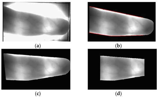 Misalignment between enrolled and recognized images hinders matching and causes low recognition performance. In this research, to solve these problems, in-plane rotation compensation was conducted on the input finger images. As shown in Figure 2d, for an accurate rotation angle measurement in the obtained finger images, a 4 × 20 mask was used to detect the upper and lower boundaries of finger-veins, as shown in the red-colored lines of Figure 3b [,]. After this, the two-dimensional moment of the finger region between these two boundaries is calculated and used for in-plane rotation compensation []. Because there are many cases where the left and right ends of the compensated finger regions contain areas unsuitable for recognition due to uneven illumination that is caused by nails and finger thickness, the final finger ROIs are detected, as shown in Figure 3d, after removing a defined portion of the left and right ends. These ROIs are used for finger shape and finger-vein recognition.