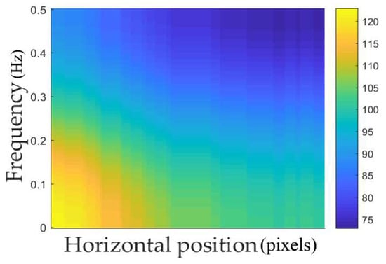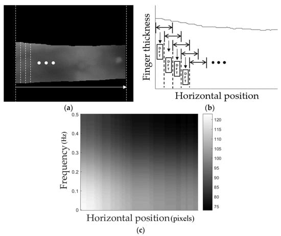 Here, n is the horizontal position of the finger ROI, w is the frequency, x[m] is the signal to be analyzed, and W[m] is a window. Through this, the two-dimensional spectrogram, which is the magnitude of the frequency of each horizontal position, was found, as shown in Figure 4c, and used as input images for CNN. This two-dimensional spectrogram image expresses the difference in the frequency amplitude of the horizontal position axis as a color-density difference. That is to say, as shown in Figure 4c, greater finger-thickness changes inside the corresponding window are indicated by brighter high-frequency areas, and smaller changes are indicated by brighter low-frequency areas.