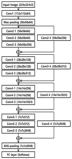 In ResNet CNN, a bottleneck structure is used []. As shown in Table 2, first, the feature map dimension was downscaled in a 1 × 1-size convolution layer, and features were extracted in a 3 × 3-size convolution layer. To connect the previous feature map with the feature map that passed through a shortcut path that is transmitted as-is to the following layer, a 1 × 1-size convolution layer was used again in the following convolution layer to expand it to the same size of the feature map dimension that passed through the shortcut path. Through this bottleneck structure, the number of learning parameters decreases more than in a single 3 × 3-size convolution process, thus reducing the amount of computation that is required []. By transmitting the previous feature map as-is to the following layer using a shortcut path, which is an important characteristic of ResNet structures, the loss of important residual information of the feature map, which is lost during convolution processing, can be somewhat reduced. This feature map, which has passed through convolutional layers, finally goes through an average pooling, which processes the average value within a window and recognizes the label class through a fully connected layer. Due to this, degradation problems occurring when the layers become deep are solved and the learning is optimized.