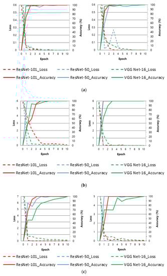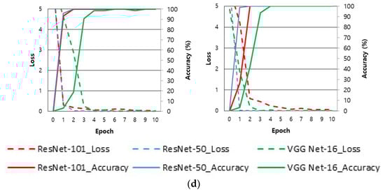 The data-augmented input images were used to conduct learning using the proposed CNN structure. For optimized CNN learning, the stochastic gradient descent (SGD) method was used []. This SGD method rapidly converges the training accuracy and loss while reducing the learning rate with the value that was calculated by multiplying gamma values step by step so that the training does not diverge at each epoch by mini-batch units. In this experiment, it was verified that convergence occurs rapidly when using a learning rate of 0.001, a momentum of 0.9, a gamma of 0.1, a mini-batch of 20 for ResNet-50 (15 for ResNet-101), and a maximum epoch of 10. After five epochs, the learning rate was reduced. The result of dividing the entire training data by the mini-batch size is called the number of iterations. One epoch is when as much training has been performed as the total number of iterations. Therefore, the total number of trainings is equivalent to the number of iterations × epoch. Table 4 shows an explanation of the initial parameters used during CNN training, and Figure 8 shows the training accuracy and loss of the VGG Net-16 [] used for ResNet CNN and performance comparison in this study. The x axis in Figure 8 shows the number of epochs, and the y axis shows the training loss and accuracy of each epoch. As shown in Figure 8, through training, the accuracy converges near 100 and the loss becomes nearer to 0.