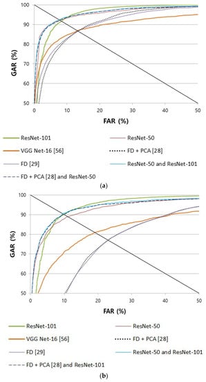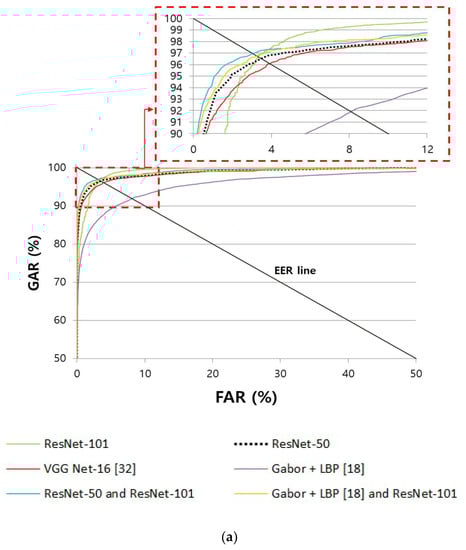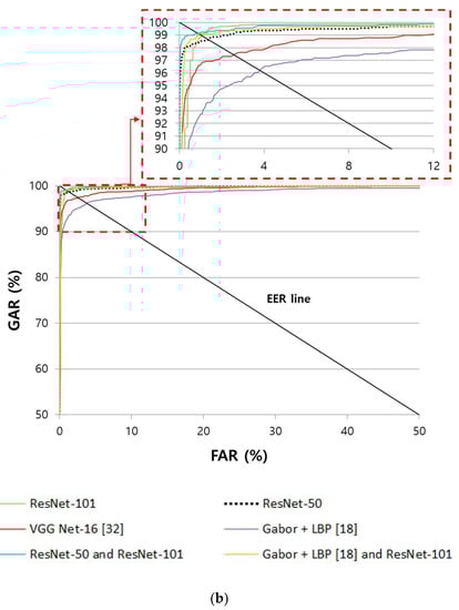 Moreover, Figure 9 shows the receiver operating characteristic (ROC) curves. Here, the genuine acceptance rate (GAR) is calculated as 100−FRR (%). As described before, this was expressed as the mean curve of the two ROC curves obtained through two-fold cross-validation. As shown in Figure 9, it was confirmed that the accuracy of the finger-vein recognition method proposed in this study is higher than that of existing methods.