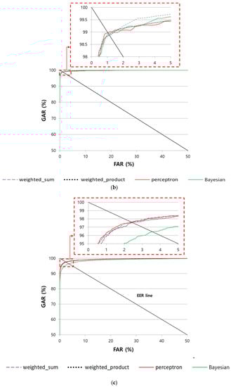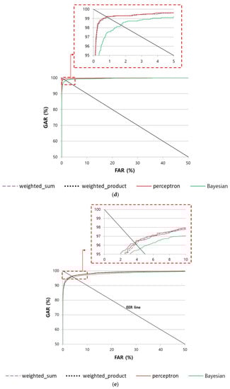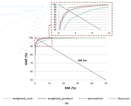 In the following experiment, the recognition performance of the various score-level fusion methods explained in Section 3.7 was compared against the finger-vein and finger shape recognition methods that were proposed in this study. Moreover, to compare the performance of various CNN models, the accuracy obtained when VGG Net-16 was used [], not the ResNet method used in this study, was also compared. As shown in Table 8 and Figure 12, the perceptron rule-based method displayed the best performance, and SDU-DB and PolyU-DB displayed an EER of 2.3445% and 0.7859%, respectively.