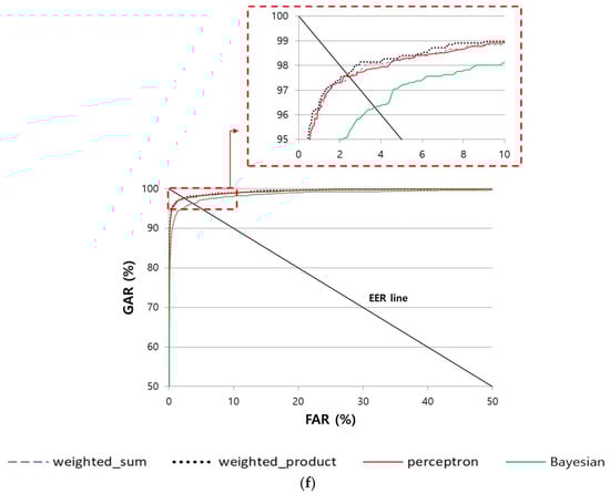 Comparison of ROC curves of multimodal recognition according to various score-level fusions in the case using (a) ResNet-50 with SDU-DB, (b) ResNet-50 with PolyU-DB, (c) ResNet-101 with SDU-DB, (d) ResNet-101 with PolyU-DB, (e) VGG Net-16 with SDU-DB, and (f) VGG Net-16 with PolyU-DB.