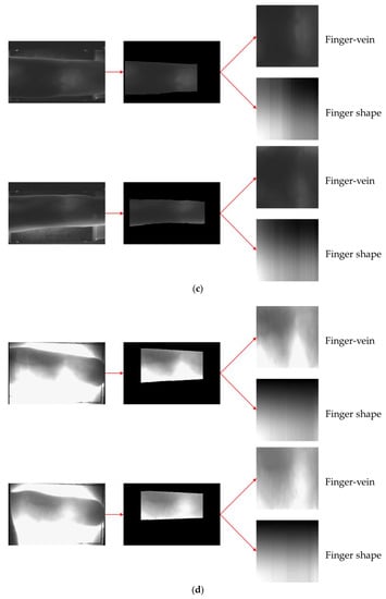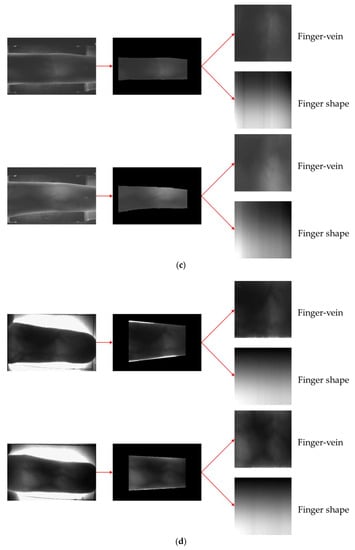 Figure 13 shows the correct recognition cases by our method. Figure 13a,b show the correct acceptance cases, and the input images are correctly recognized as genuine matching, although there exists the misalignment of finger-vein positions between the enrolled and input images. Figure 13c,d present the correct rejection cases, which means the enrolled and input images are from a different class. As shown in Figure 13c,d, input images are correctly rejected as imposter matching based on the difference of finger shapes between the enrolled and input images, although finger-vein patterns are difficult to be observed in these two images due to low illumination. Figure 14 shows the error cases of the method proposed in this study. False rejection cases mainly occur because of the misalignment between finger-vein images due to finger position changes between the enrolled and recognized images (Figure 14a,b), and because of the difference between finger shape spectrogram images due to finger rolling (Figure 14a,b). False acceptance cases mainly occur because areas of finger are so dark (Figure 14c) or bright (Figure 14d). In addition, in the case of Figure 14d, the correct boundary of finger shape cannot be extracted by the highly saturated region inside of finger. To solve these problems, the study on compensation method of severe finger rolling and illumination variation is necessary as the future work.