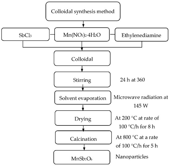 The manganese antimonate nanoparticles were prepared using the microwave-assisted colloidal method. For this, 1.25 g (5 mmol) of Mn(NO3)2∙4H2O (Sigma-Aldrich, St. Louis, MO, USA), 2.28 g (10 mmol) of SbCl3 (Sigma-Aldrich), 0.5 mL (8 mmol) of ethylenediamine (Sigma-Aldrich) and ethyl alcohol as a solvent (Golden Bell, Taiwan) were used. The amounts of the Mn and Sb precursors were calculated according to the nominal composition of the MnSb2O6 (ratio Sb:Mn = 2:1). To each reagent, 5 mL of alcohol was added and then stirred for 30 min in order to obtain homogeneous solutions. Subsequently, the solutions with ethylenediamine and antimony chloride were mixed together under stirring. After that, manganese nitrate was added, obtaining a white solution, which was stirred vigorously at 360 rpm for 24 h in air at room temperature. The solvent was evaporated by making 16 applications of microwave radiation at a low power (145 W, with a duration of 1.2 min per application) using a domestic microwave oven (LG model MS1147, Guadalajara, Jal., Mexico). Subsequently, the precursor material (a white paste) was dried at 200 °C in air for 8 h and then calcined at 800 °C for 5 h at a rate of 100 °C/h by way of a muffle with programmable temperature control (Novatech, Tlaquepaque, Jal., Mexico). Figure 1 illustrates the process for obtaining the MnSb2O6 nanoparticles.