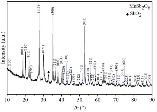 where λ is the wavelength of the radiation (λ = 1518 nm), θ is the Bragg angle and β is the full width at half maximum (FWHM) of the diffraction peak. The calculation was carried out considering all the peaks of the main phase of the MnSb2O6 shown in Figure 2, finding that the average crystallite domain was of ~36.6 nm. The results presented in Figure 2 are consistent with other studies on the same material [25] or similar compounds belonging to the antimonates family (MSb2O6, where M = Mn, Cu, Co, Ni, among others) [1,2,3,4,20,25].