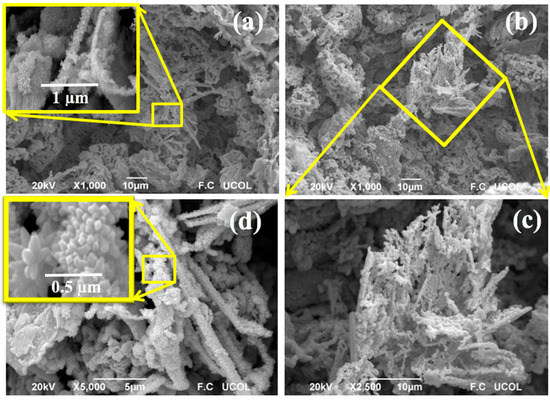 The use of ethylenediamine to produce different types of nanostructures (such as nanowires and nanorods) has already been discussed in previous works [26,28]. In particular, ethylenediamine acts as a modulating agent of the microstructure, incorporating itself as a mesh in the inorganic particles, to subsequently escape from them due to the applied thermal treatment, causing the nucleation and formation of the morphology shown in Figure 3a–d.