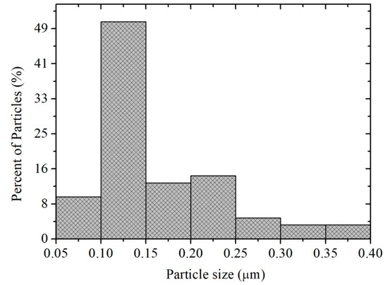 In Figure 3a, the microstructural composition of the material is broadly observed. It can be clearly seen the appearance of several types of morphologies formed by irregular particles of different sizes. The type of microstructure with greater abundance in this area was due to the growth of very fine particles with an average size of ~1.3 μm. It was also possible to identify a morphology similar to micro-rods (see inserted image) with sizes in the range of 4–20 μm, with an average size of ~10.27 μm and a standard deviation of ~4.1 μm. The morphology shown in Figure 3a–c appears to be a fibrous and porous surface. Figure 3d, obtained at a higher magnification (5000×), shows that the micro-rods are formed by the agglomeration of particles (see inserted image). The size of the particles that shape the micro-rods was estimated in the range of 0.05–0.4 µm, with an average of ~0.159 µm and a standard deviation of ~0.068 µm (see Figure 4). This type of microstructure is attributed to the agglomeration of particles that grew due to the temperature and the chelating agent (ethylenediamine) employed during the synthesis process [5,7]. The porosity on the material’s surface was due to the release of gases produced during the thermal treatment of the material [26], which caused the decomposition of organic species but mainly water vapor, NOx and CO2 [27].
