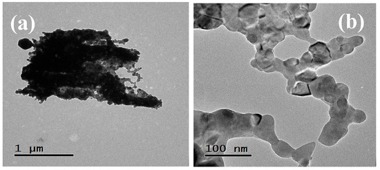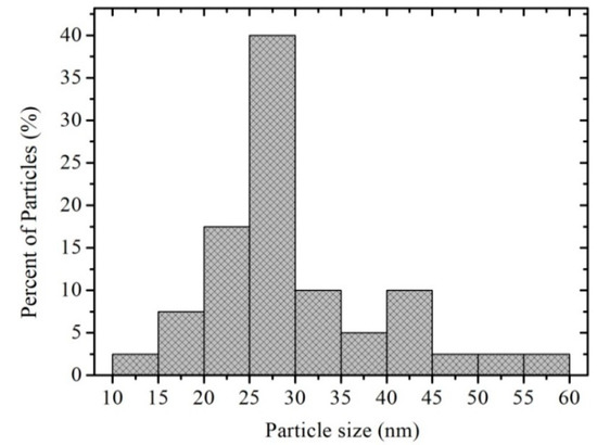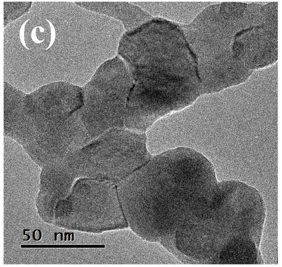 In Figure 5, three TEM photomicrographs of the antimonate particles calcined at 800 °C are shown. These images confirm the production of nanoparticles of different morphologies and sizes. According to the analyses made in this area of the material, a large agglomeration of nanoparticles can be observed due to the effect of the calcination temperature and the residence time of the precursor material in the muffle. The dark areas depicted in Figure 5a are due to the low electron transmission that occurs because of the nanoparticles agglomeration on the material’s surface. It can be observed in Figure 5b,c that the nanoparticles are joined to each other by the formation of necks due to coalescence. The size of the nanoparticles was estimated in the range of 10–60 nm, with an average of ~29.5 nm and a standard deviation of ~9 nm (see Figure 6).