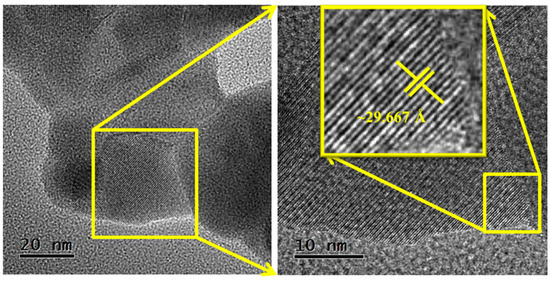 In Figure 7, high-resolution TEM (HRTEM) images of the surface of a nanoparticle (size ~34.2 nm) are shown. This demonstrates the crystalline nature of the manganese antimonate, since the crystalline planes formed on the surface of the particles joined by the necks can be observed (see the inserted image). The distance d between the crystalline planes was estimated on a selected area of a nanoparticle. According to this, the distance between the planes is of ~29.667 Å, which corresponds to the plane (021) of the MnSb2O6’s crystal structure, with a diffraction angle of 2θ = 30.097°. This result can be corroborated by the X-ray diffraction analysis shown in Figure 2.