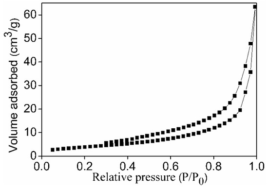 Figure 8 shows a nitrogen adsorption-desorption isotherm of the MnSb2O6 powders. The shape of the isotherm is of type II according to the IUPAC classification. This isotherm, which shows a hysteresis, is characteristic of non-porous or macroporous adsorbents. The surface area of the MnSb2O6 powders, according to the BET (Brunauer–Emmett–Teller) method, was estimated at 14.6 m2/g. In general, mixed oxides usually have relatively low surface areas (<10 m2/g) when prepared by traditional methods [27]. The synthesis of sensor materials with larger surface areas can therefore favor the adsorption of gases and, consequently, increase their response.