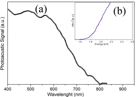 In order to determine the optical properties of the MnSb2O6, a photoacoustic spectroscopy (PAS) study has been performed. A PA spectrum as a function of the wavelength from 400 to 830 nm is shown in Figure 9a. The optical energy band gap () was determined from the high absorption region (, where is the incident energy). In this region, the direct allowed transition is given by the equation [30]: