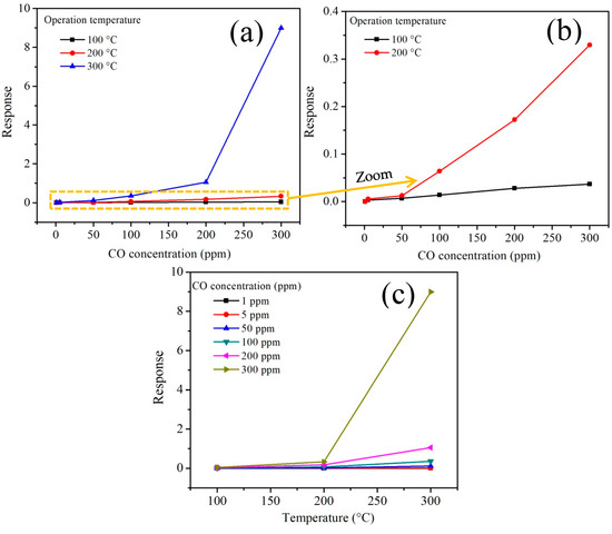 Response of the manganese antimonate nanoparticles in terms of (a) CO concentration, (b) concentration at 100 and 200 °C and (c) temperature.