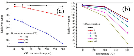 As can be observed in Figure 11, with the increase of CO concentration, the resistivity of the MnSb2O6 nanoparticles decreased. In addition, the effect of temperature played a very important role in the response of the material. As the operating temperature increased (from 100 to 300 °C), the MnSb2O6 pellets exhibited a very significant decrease in electrical resistivity. This behavior is typical of a semiconductor material used as a gas sensor [34,39]. Thus, at 100 °C, the highest resistivity of the material was recorded. When the temperature increased to 200 °C, the pellets showed a slight decrease in electrical resistivity. In addition, with the increase in temperature, the material showed inflection points on the resistivity at 200 °C. The poor response obtained at these temperatures (100 and 200 °C) is largely due to the fact that the thermal energy was not enough to provoke the reaction of the CO molecules with the oxygen present on the pellets’ surface [34]. On the contrary, when the temperature was raised to 300 °C, the values of the electrical resistivity in CO atmospheres decreased very significantly. The values found at this temperature were 87.0, 85.88, 78.19, 64.18, 42.26 and 8.71 Ωm. The results shown in Figure 11a,b are consistent with similar oxides tested in the same gas [34,39,40].