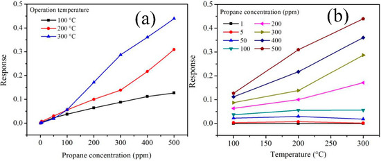 The tests in propane atmospheres (C3H8) were carried out at different concentrations (1–500 ppm) and operating temperatures (100, 200 and 300 °C). The results under these working conditions are shown in Figure 12.