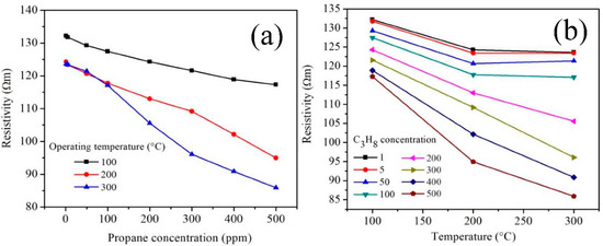 As in the case of CO, the electrical resistivity (ρ) in propane atmospheres at temperatures of 100, 200 and 300 °C was estimated using the equation ρ = RA/t [39]. The results are presented in Figure 13 as a function of propane concentration and operating temperature. As shown in Figure 13a,b, with the increase in temperature, the material’s resistivity decreased in a similar manner to the case of CO. We have confirmed that by injecting the different concentrations of propane (1–500 ppm) into the measuring chamber, the pellets’ resistivity decreases significantly. This is attributed to the fact that with the increase of the operating temperature, the mobility of the solid material’s charge carriers is more active on the pellets’ surface [34,43], which contributes to the increase of the material’s electrical conductivity proportionally to the reduction of its electrical resistivity in C3H8 atmospheres [44]. In addition, the increase in the concentration of propane favored the low electrical resistivity obtained at high temperatures (in our case at 200 and 300 °C). This means that with the increase of the operating temperature, the kinetic activity of the propane gas molecules increased, leading to the results shown in Figure 13a,b. It has been reported that for the response of a material such as the one used in this work, the changes in electrical resistivity depend on the sensor type employed [34] since the interaction between the gas molecules and the chemisorbed oxygen varies depending on the geometry of the sensor (e.g., pellets or films) [34,39,44]. In our case, the variation of the pellets’ electrical resistivity at 300 °C was of 123.52, 123.39, 121.36, 17.08, 105.54, 96.05, 90.85 and 85.88 Ωm. This trend generally occurs in semiconductor oxides when exposed to gases at high temperatures [34,43,45,46,47,48], as in our case (see Figure 13a,b).