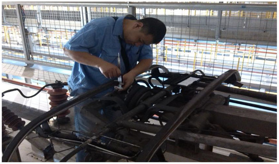 Traditional detection of the pantograph needs the locomotive to be driven into the depots and parks and bowed down with the power off. Subsequently, maintenance staff on the roof inspected the pantograph for abnormal wear and special tools are used to measure abrasion of the pantograph [14]. Figure 1 presents the traditional detection method. At present, in the domestic operation of the railway line, this traditional method of detection is still one of the main methods. However, because of its low efficiency, big workload and low accuracy, there is little measurement. The method cannot adapt to the rapid development of railway transportation.