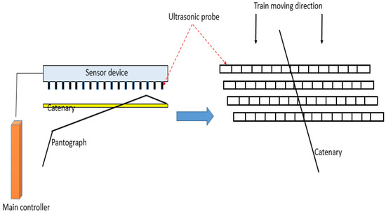 In Japan, the East Japan Railway Company developed the pantograph slide abrasion automatic measuring device and the schematic of its principle is as follows (Figure 2). In the device, sensors are adopted to project waves to the object through the air and then reflected waves are sent back to the sensor. According to the transmission time of the ultrasonic wave and the wave velocity passing at that time, the surface thickness of the skateboard was obtained after calculation and the concave and the groove of the skateboard’s surface were detected [15]. In addition, the device adopts the ultrasonic ranging principle.