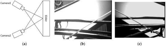In China, Southwest Jiaotong University has developed the electric bow and the roof condition dynamic monitoring system [14]. This system can be used to detect the abrasion of the slide, which can describe the wear curve for the reference of maintenance personnel. The main feature of this system is that it is installed on the locomotive warehousing line with high efficiency and low speed. Besides, it mainly uses the six charged couple device (CCD) cameras with flash lights, including 2 sets used to get centerline deflection and the remaining 4 sets used for slide abrasion with image processing. For the slide detection cameras shown in Figure 3, each camera captures more than half of the pantograph slide. However, since 3D information of the bow is unavailable, it cannot get the calculation result of the missing block.