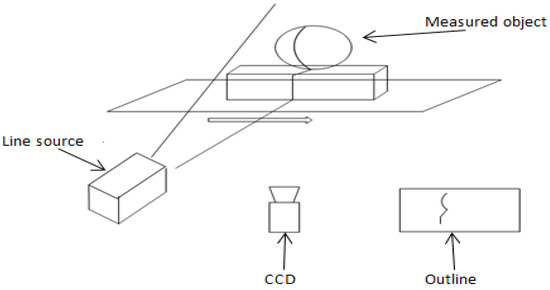 The basic idea of structured light 3D detection technology is to use the geometric information of the lighting source to extract the geometric information in the scene. The light stripe is generated on the surface of the object by using a light plane and the fringes are detected in the images considering the shape and the discontinuity of the stripes. Based on the geometry of the light source, the structured light includes spots, stripes and meshes. This method has the advantages of reduction of the calculation complexity, high speed of scanning and the high precision of measurement [4]. It is especially suitable for the indoor environment, where the surface reflection of the object is relatively good. The principle of structured light 3D detection is presented in Figure 4.