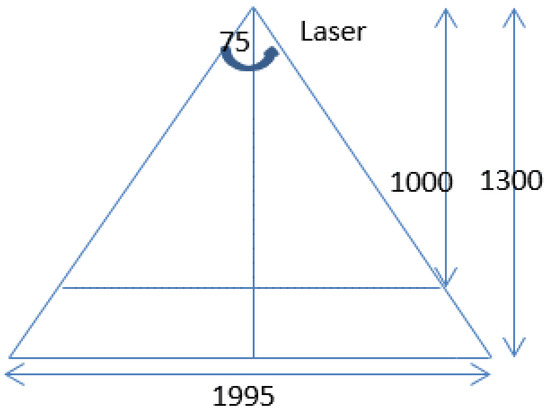 The laser divergence angle is 75 degrees and the width of the pantograph in the workshop is 1450 mm. The required parameters can be calculated according to Figure 7. If the laser line is used to cover the whole pantograph, the height of the surface of the laser hole should be at least 945 mm. The height is set to 1000 mm and the height of the pantograph itself is 300 mm. The height of the camera should be in the range of 1000 mm–1300 mm and the nearest distance and the longest distance of the laser line are 1534.5 mm and 1995 mm respectively, which can satisfy the requirements of the pantograph detection.