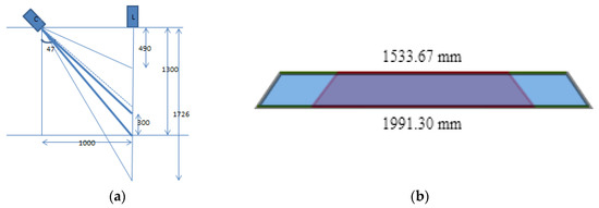 Suppose the angle of the axis camera and the laser center axis is 47 degrees, the focal length of the lens is 8 mm and the distance between the laser and the camera is 1000 mm. In this case, the minimum height of the laser line in the full view is 490 mm and the maximum height is 1726 mm. The height of the shooting range of 1000–1300 mm is taken into account which comply with this range. The vertical direction on the surface of the camera and the laser surface position are shown in Figure 8.