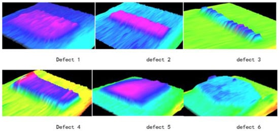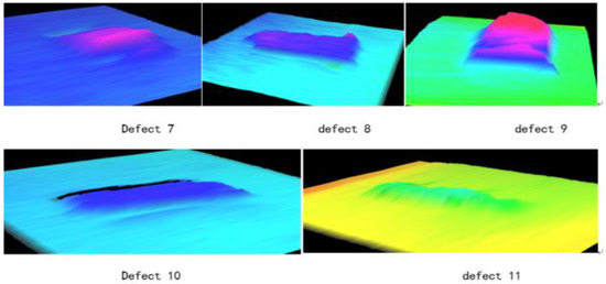 By mapping 3D data onto two-dimensional images, a strength image is formed, as shown in Figure 16. Then, a gradient operation is performed on the whole image to get the edge information of the defect to screen out the possible slide block area. Then, in view of the possible candidate areas, the location of the actual skateboard falling blocks is selected according to the size of the area and the height difference between the inside and outside of the area. Because the standard thickness of the patch is simulated in the experiment, the thickness of each defect is calculated by calculating the average value of each real area, as shown in Table 1.