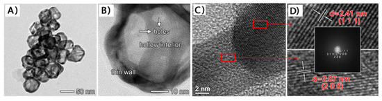 Figure 1A shows a typical TEM image of the AuNCs, which displayed well-defined hollow shapes with thin walls and holes on the surfaces. The average external diameter and wall thickness of the hollow particles were measured to be 54.3 nm and 5.4 nm, respectively, with narrow size distributions. The high-resolution TEM (HRTEM) image of an individual particle (Figure 1B) further clearly shows the features of the hollow interiors, thin walls, and porous surfaces for AuNCs. These TEM results demonstrate that the AuNCs used were of high quality, thereby forming the basis for the construction of the subsequent electrochemical sensor. According to the fast-Fourier transform electron diffraction pattern and XRD standard card {PDF#04–0784}, we revealed that AuNCs belonged to {111}, {200}, {220}, and {311} crystal forms based on its lattice fringe separations, and the nanomaterial mainly presented {111} and {200} crystal faces whose lattice fringe separations were calculated as 2.41 nm and 2.07 nm, respectively.