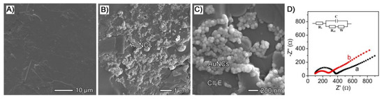 SEM images of a carbon ionic liquid electrode (CILE) (A) and AuNCs/CILE with different magnification (B,C); (D) Nyquist plots of CILE (a) and AuNCs/CILE (b) in a 10.0 mmol/L [Fe(CN)6]3−/4− solution containing 0.1 mol/L KCl with the frequency of 105~0.1 Hz (inset is the Randles circuit model in the cell).